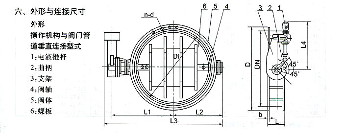 電液動(dòng)蝶閥以電液推桿作動(dòng)力源,通過雙向齒輪泵輸出壓力油,經(jīng)油路集成塊的控制送至油缸,實(shí)現(xiàn)活塞桿往復(fù)運(yùn)動(dòng),同時(shí)通過曲柄轉(zhuǎn)動(dòng)閥軸、閥板作90°范圍旋轉(zhuǎn),達(dá)到調(diào)節(jié)流量的目的。