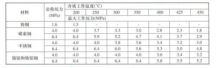 調(diào)節(jié)閥、管子及管路附件的公稱壓力、工作壓力、使用溫度的關系見表一